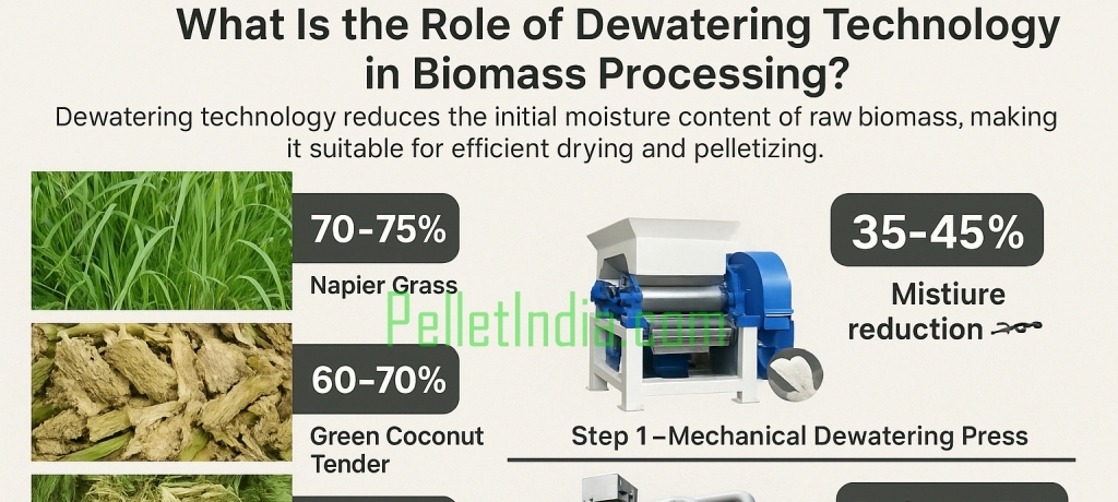 Continue readingDewatering technology plays a crucial role in the biomass pellet-making process by reducing the initial moisture content of raw biomass materials, making them suitable for efficient drying and pelletizing. Many high-moisture raw materials—such as Napier Grass, sugarcane bagasse, and green coconut husk—contain 65% to 75% moisture, which is too high for direct pellet production. To […]