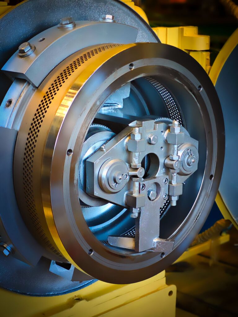 The Ring Die Pellet Mill is equipped with a heavy-duty one-piece cast gearbox that provides optimal durability under demanding conditions. A pressurized oil lubrication system ensures smooth operation of the helical gears, while the automatic grease system minimizes maintenance efforts. The mill’s innovative Dual Track technology dramatically improves efficiency by using a dual roller system that maximizes pellet output while reducing energy consumption. The increased number of die holes allows for more raw material per revolution, enhancing productivity. Overall, these features result in lower operational costs and consistent pellet quality.